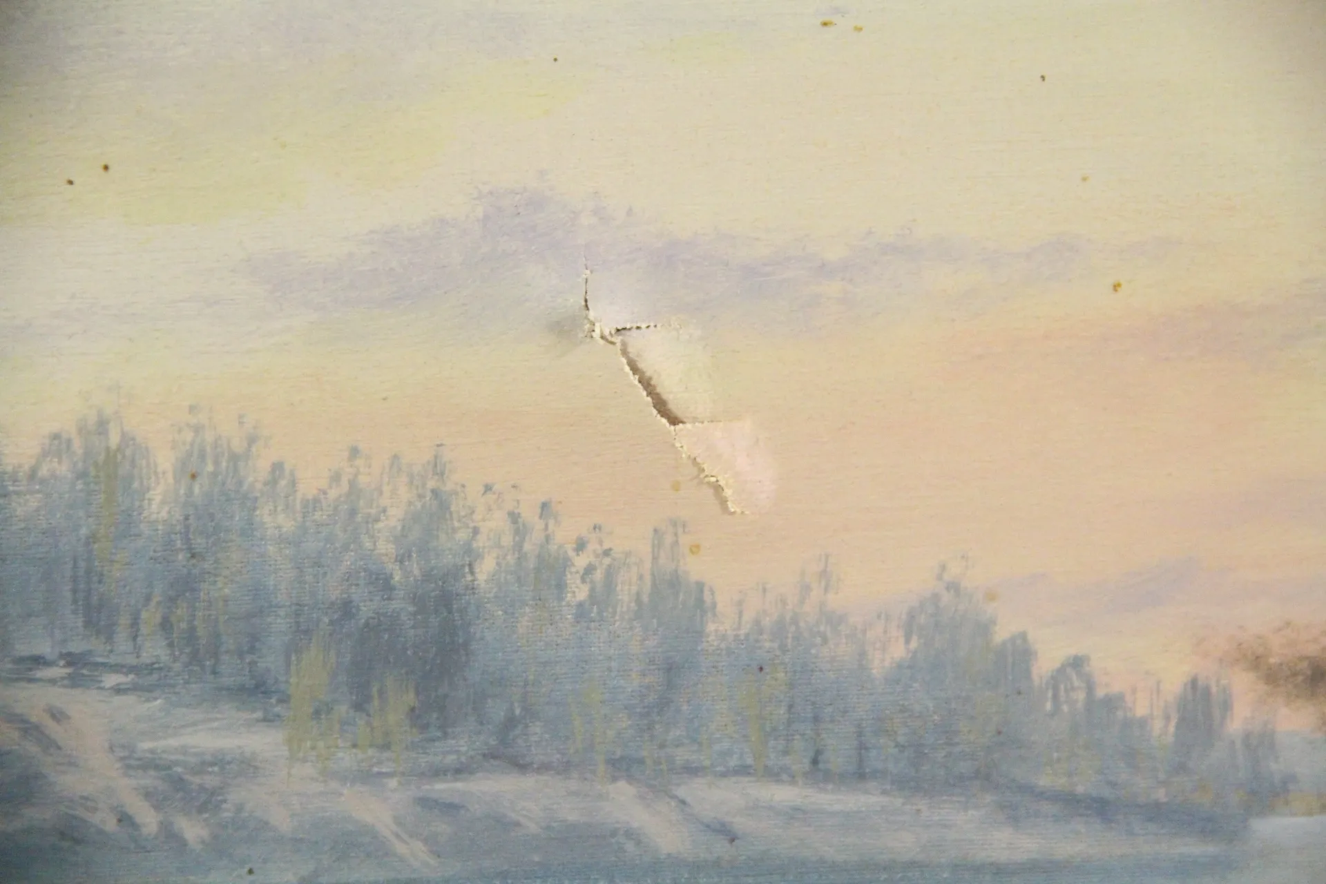 75 x 97 cm, hål i duken, duken lagad tidigare