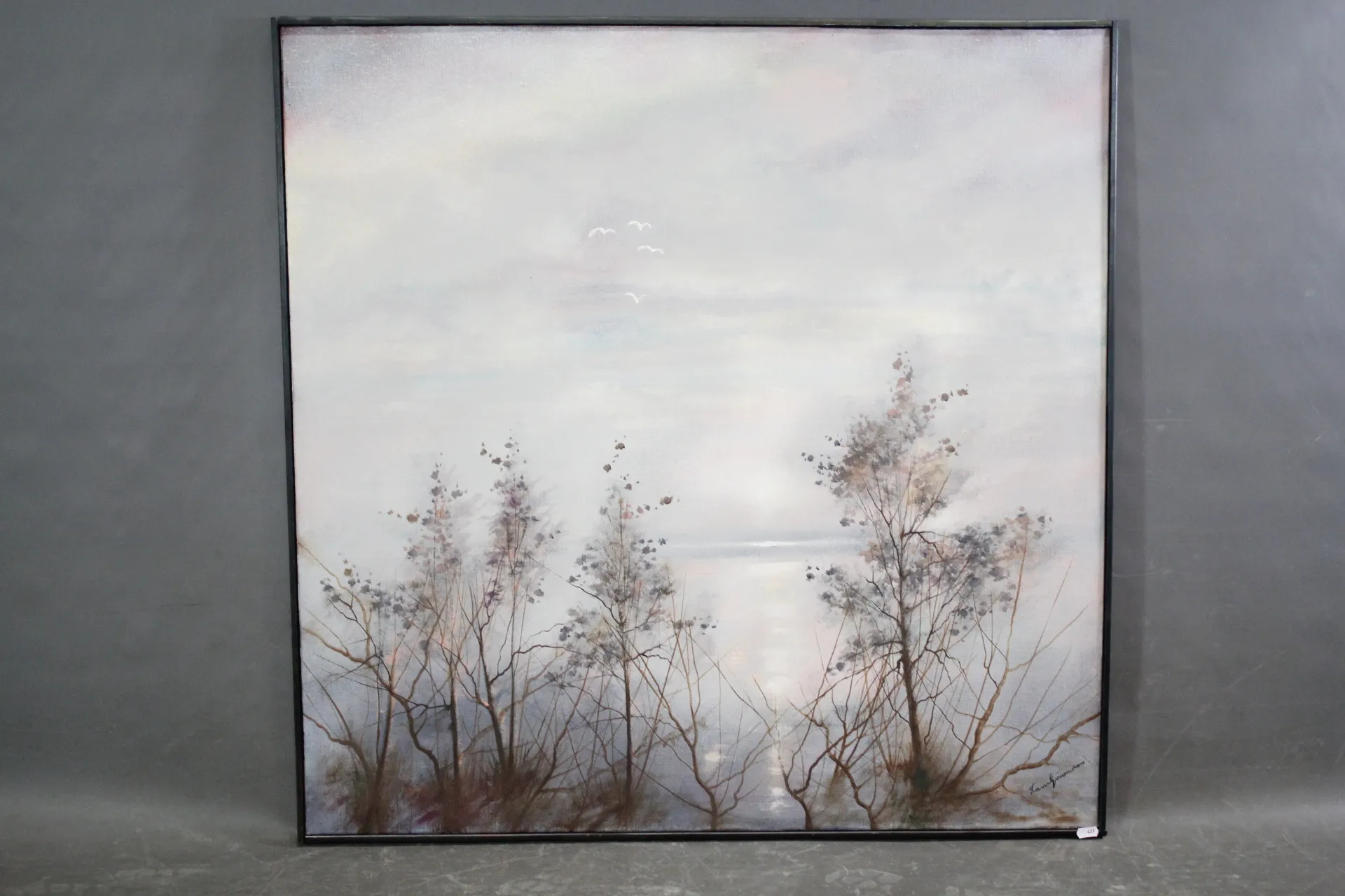 461. Tavla Olja på duk sign Lasse Göransson Kungsör "Buskar och grenverk vid barköviken 1986"