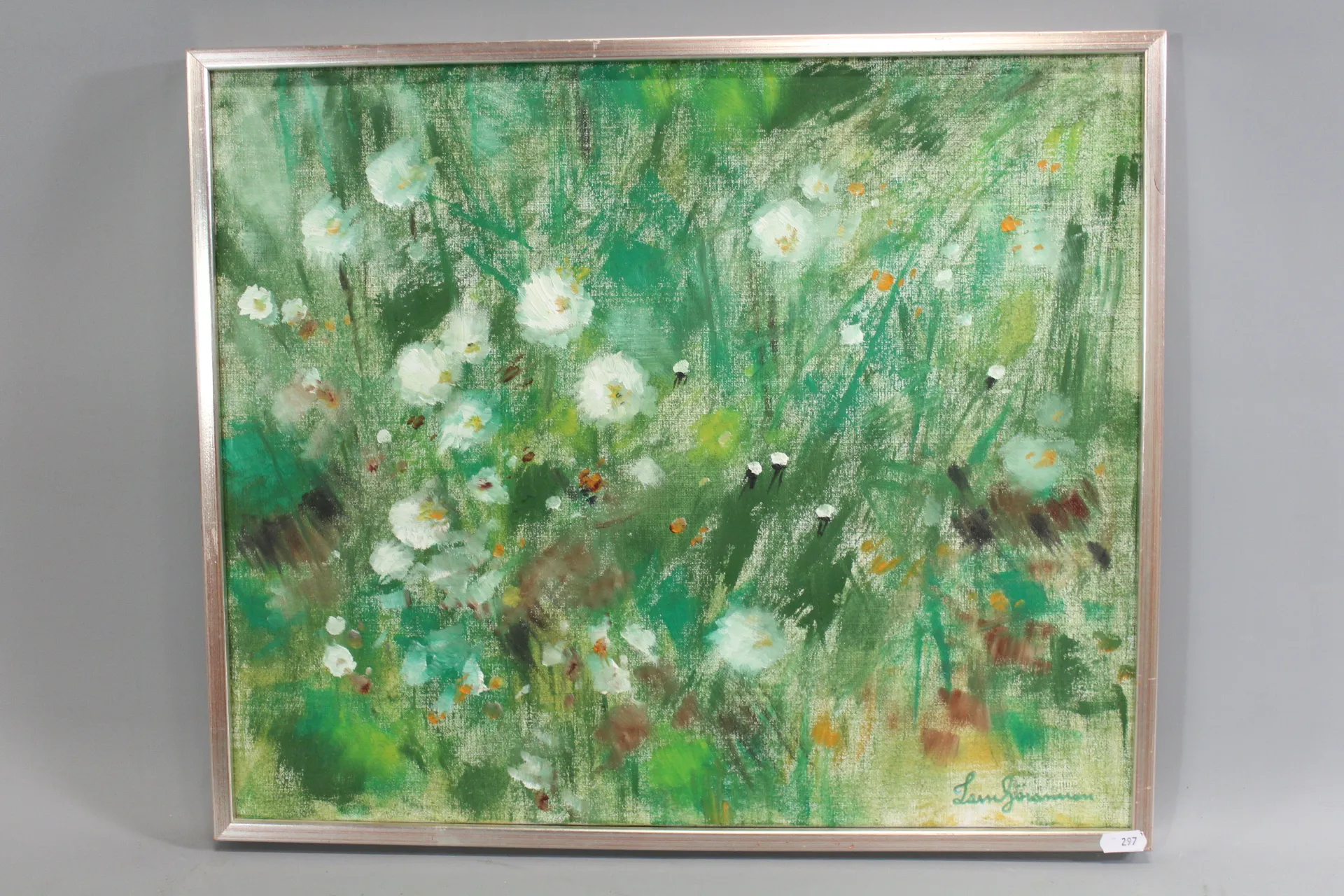 297. Tavla Olja på duk "Slocknade blommor" sign Lasse Göransson Kungsör