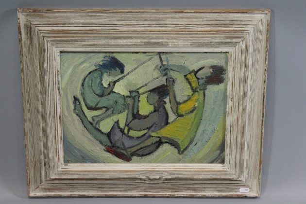 366. Tavla olja på pannå "Gungande flickor" signerad