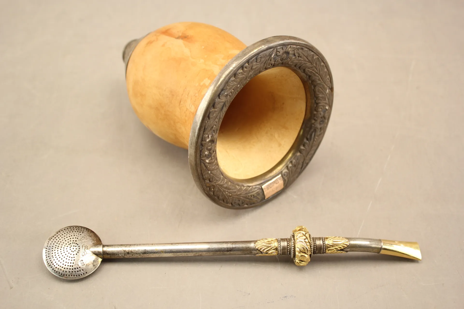 68. Tekopp med sugrör "Mate Gourd/ Bombilla" delvis i silver 600