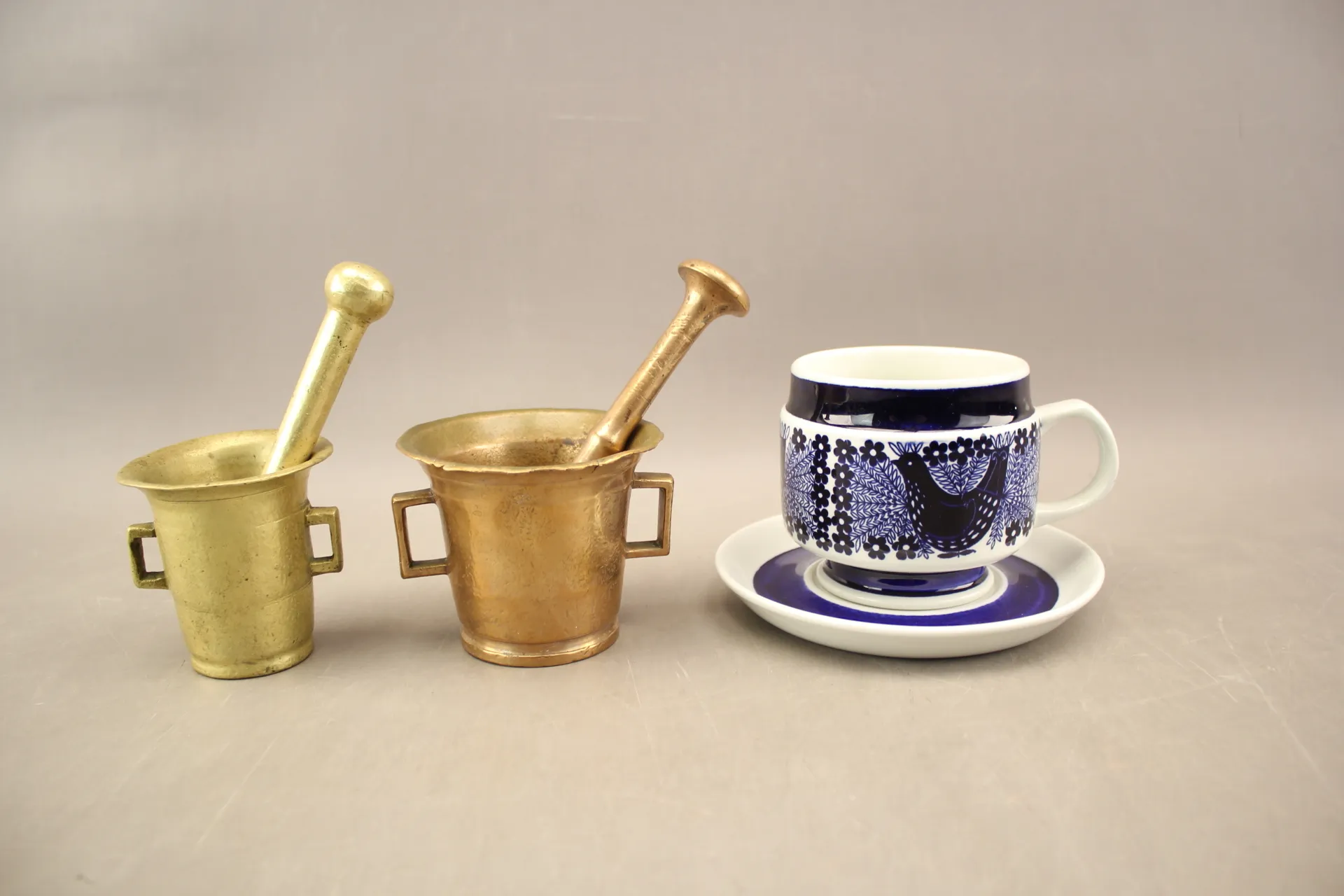 372. Tekopp och fat "Sinilintu" Raija Uosikkinen Arabia och mässingsmortlar 2 st