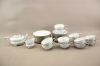 Tekoppar 12 st, tefat 12 st (5 st är naggade), assietter 12 st, tekanna och gräddkanna, krackeleringar finns