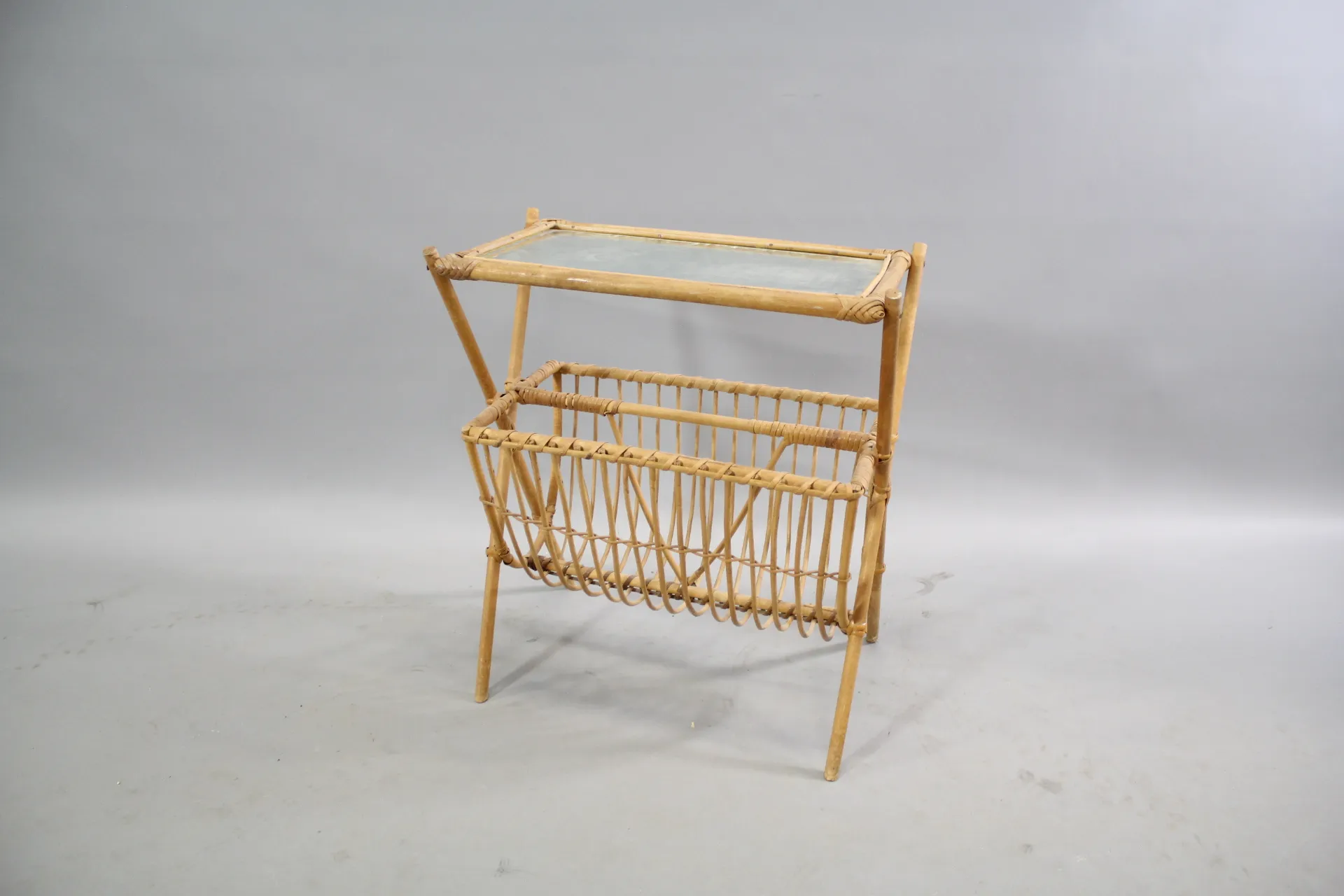 49. Tidningsställ i rotting med glasskiva 1900-tal