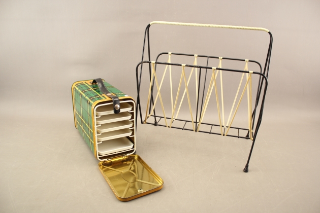 370. Tidningsställ Stringmodell och plåtburk med brickor