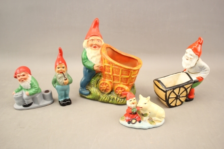 404. Tomtar 2 st, krukor 2 st och ljusstake i keramik