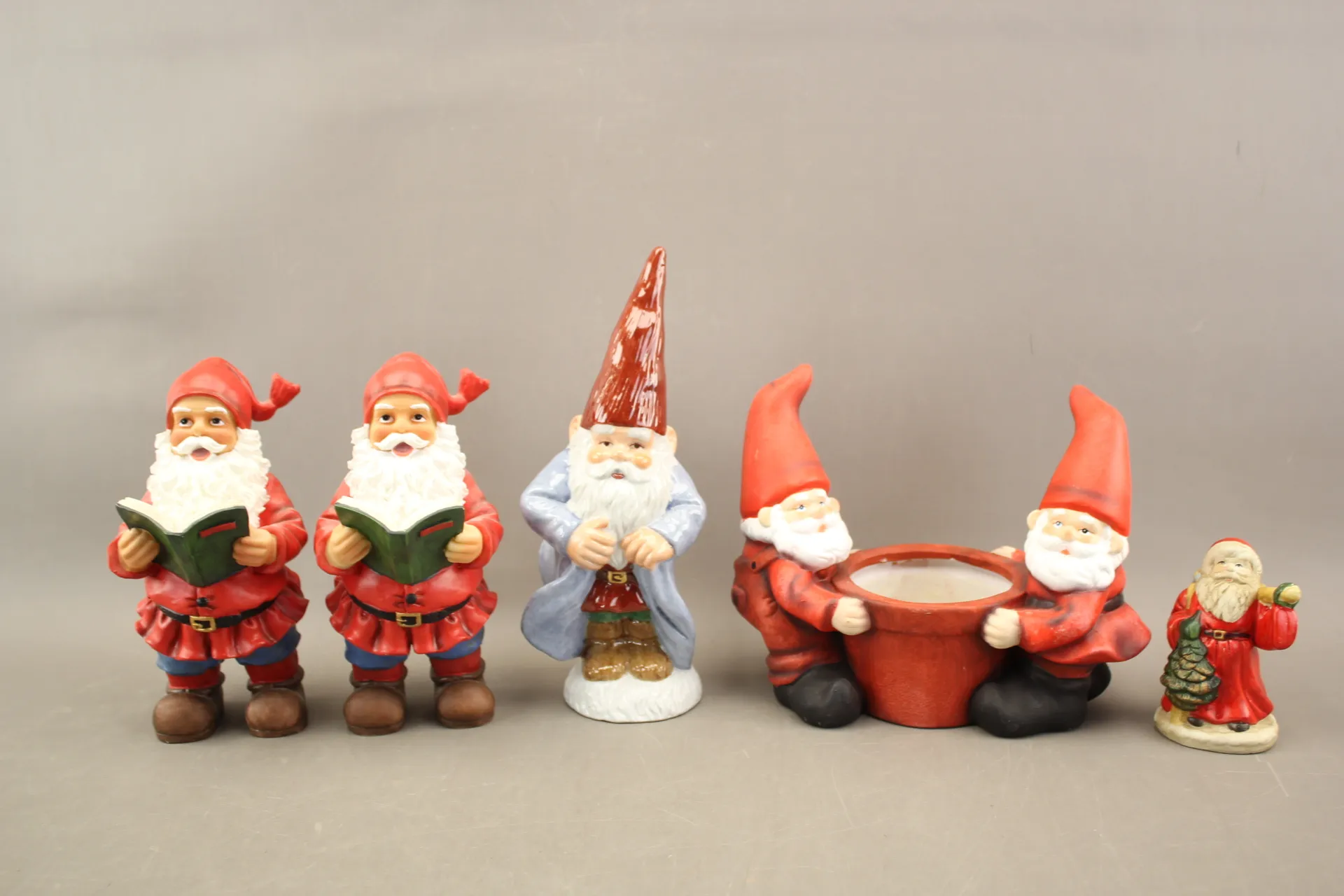296. Tomtar 4 st och kruka i bla keramik