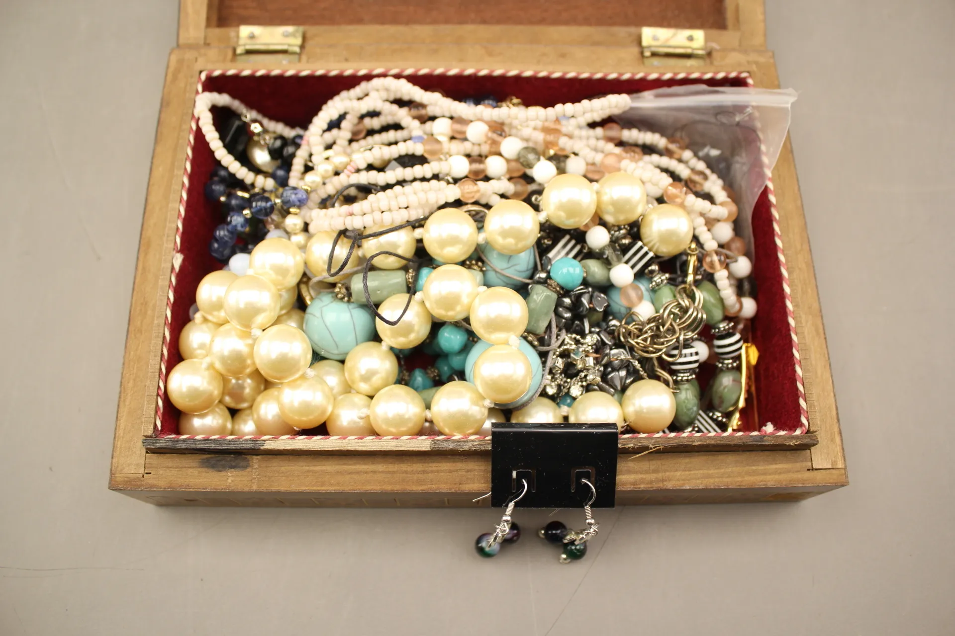 146. Träskrin med diverse smycken