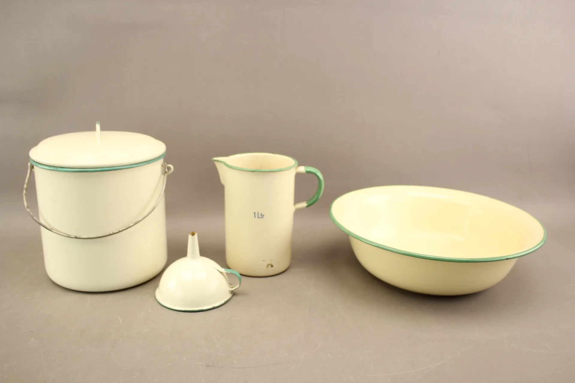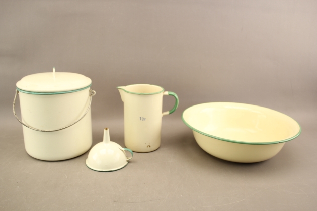 333. Tvättfat, hink,kanna och tratt i emaljerad plåt