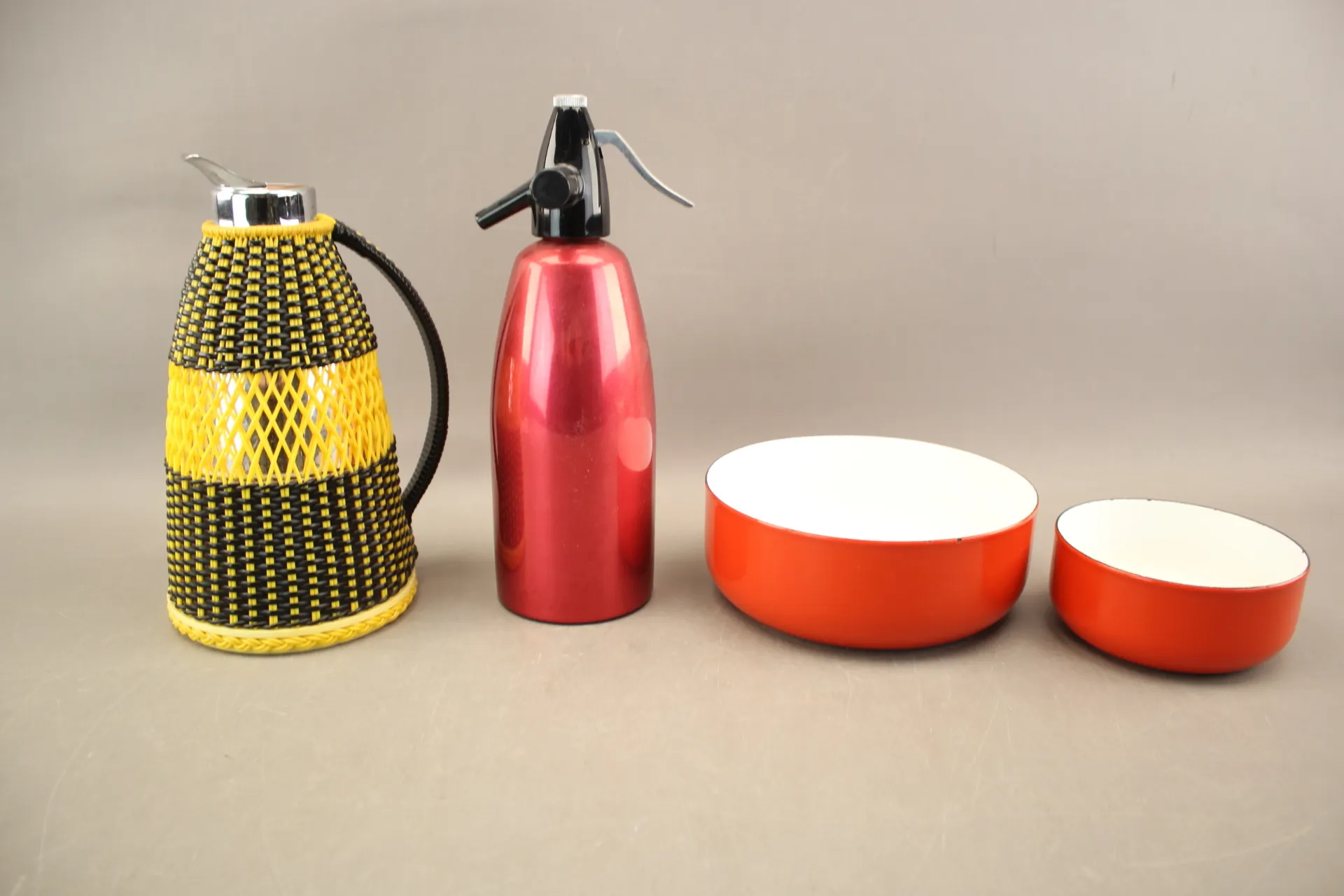 Högsta H: 31 cm, kannan saknar kork , skålarna har nagg i emaljen