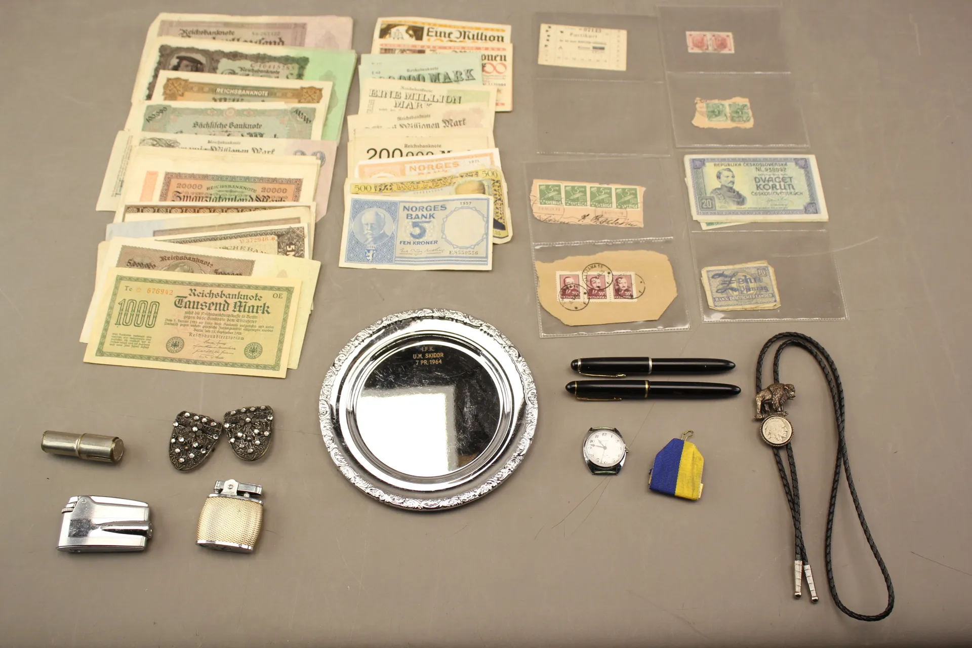 142. Utländska sedlar, reservoarpennor 2 st, tändare, mm