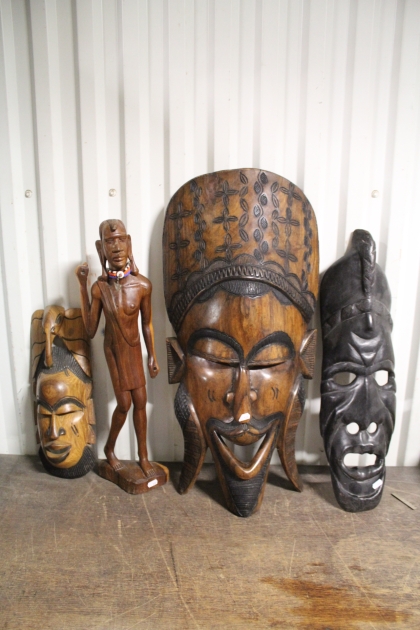 509. Väggansikten 3 st och skulptur i trä