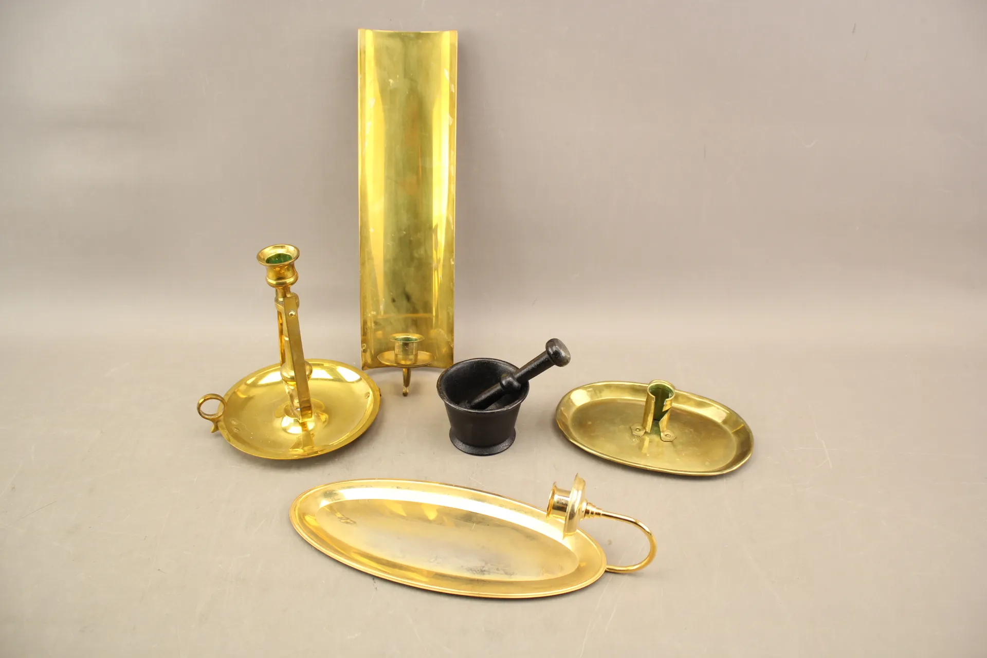 169. Väggljusstakar 2 st, ljusstakar 2 st och mortel i bla mässing