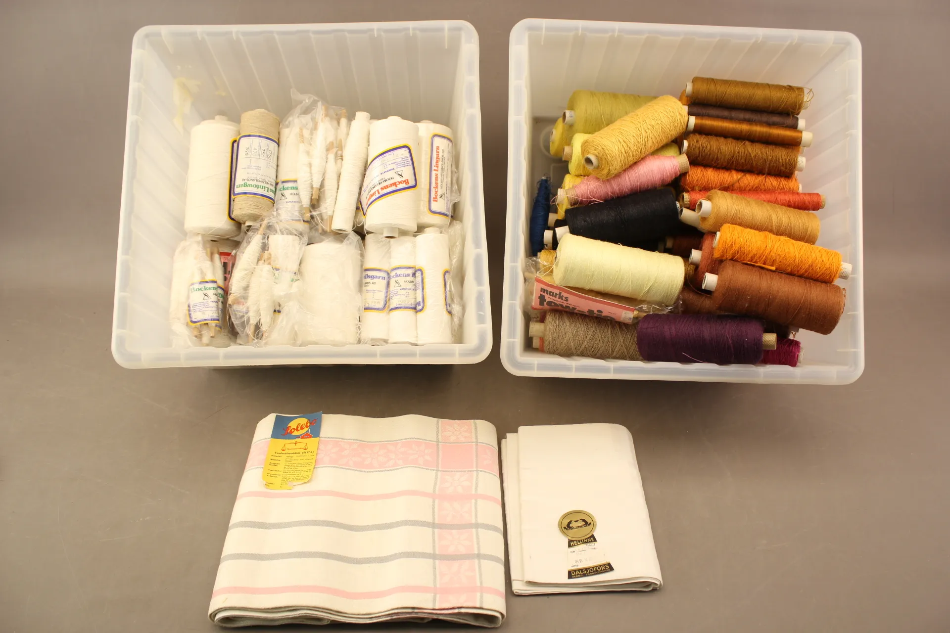 359. Vävgarn i lin 2 lådor och ofållat linne 2 delar bla Dalsjöfors