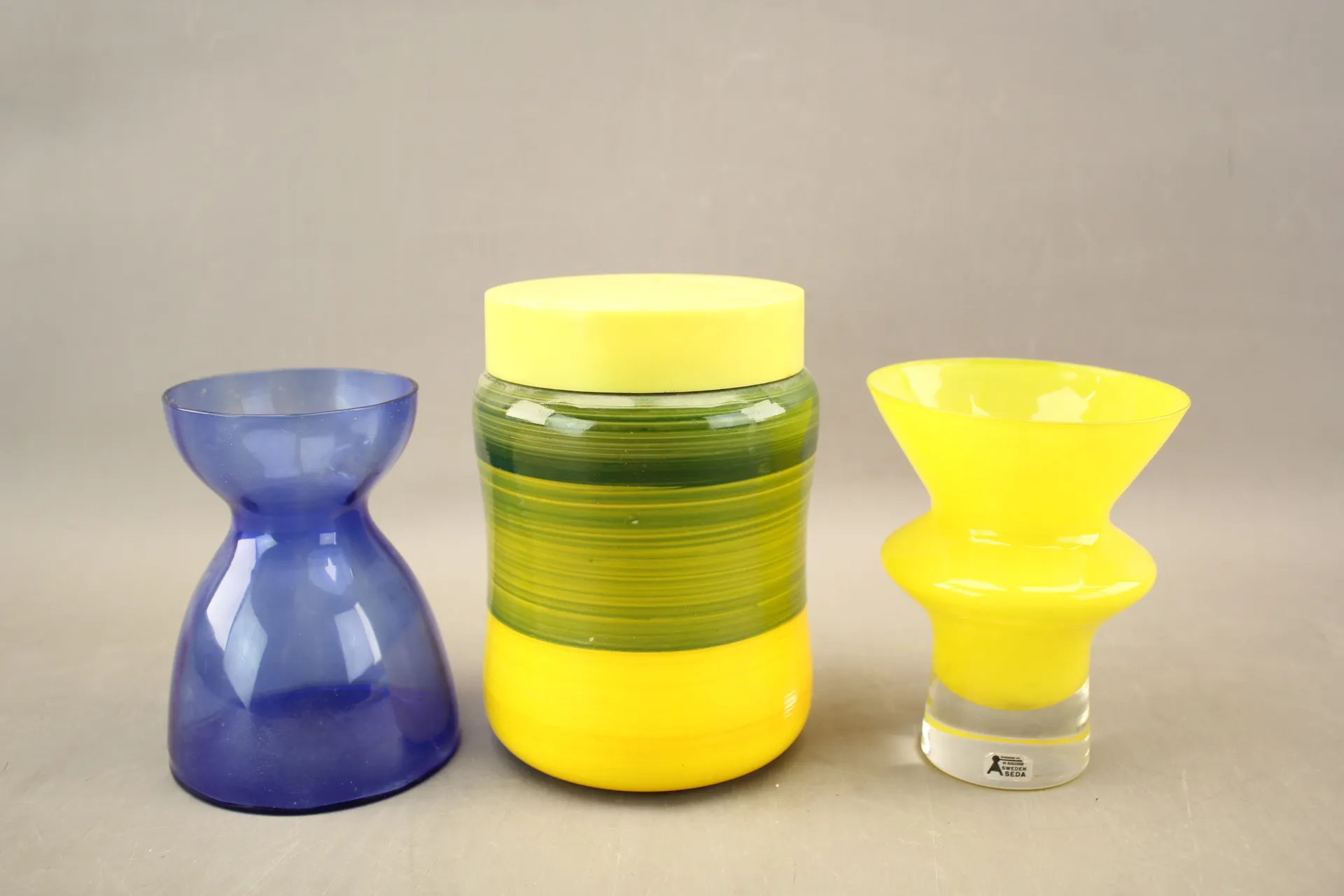 113. Vaser 2 st och burk med lock bla Åseda och Italien