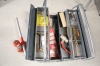 409. Verktygslåda i plåt med innehåll och domkraft