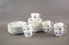 Kaffekoppar 7 st, kaffefat 18 st (3 st har nagg) och assietter 12 st, slitage