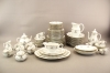 Mattallrikar 12 st, halvtallrikar 11 st, djupa tallrikar 12 st, assietter 12 st, uppläggningsfat 8 st, såskanna, tekoppar 12 st, tefat 12 st, kaffekoppar 6 st, kaffefat 6 st, kaffekanna, tekanna, kanna, sockerskål och gräddkanna