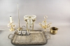 496. Vas, flaskställ, bricka, mm i bla mässing