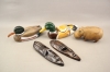 439. Träfigurer 3 st och väggdekorationer 2 st