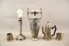 485. Vas med glasinsats, bordslampa, tekanna mm i nysilver